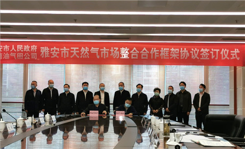 2020年4月20日,雅安市人民政府和西南油氣田公司雅安市天然氣市場(chǎng)整合合作框架協(xié)議簽約儀式在成都舉行。雅安市市委書記蘭開馳,市委副書記、市長(zhǎng)鄒瑾,市委常委吳宏,市政府秘書長(zhǎng)李陽(yáng)軍,市政府副秘書長(zhǎng)馮貴強(qiáng),西南油氣田公司黨委書記、總經(jīng)理謝軍,黨委委員、副總經(jīng)理李寶軍,總經(jīng)理助理兼營(yíng)銷部主任賀志明就推進(jìn)雙方合作深入交流,并見證協(xié)議簽約。