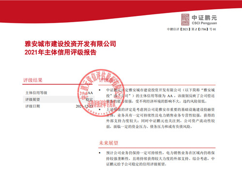 2021年12月23日,中證鵬元資信評估股份有限公司正式出具評級報(bào)告,將城投公司主體信用等級評定為AA。