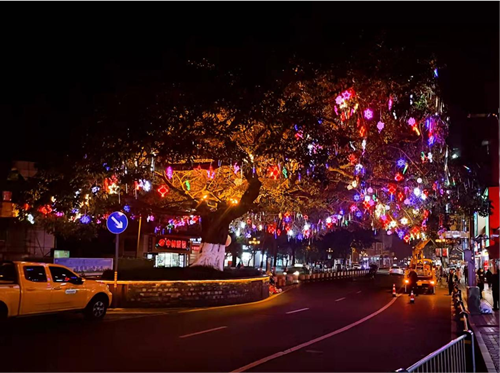 位于新民街、朝陽(yáng)街、大北街路口幾處的雅安標(biāo)志性市樹(shù)黃葛樹(shù)上都安裝滿(mǎn)了大紅燈籠、滿(mǎn)天星彩燈和漂亮多彩的掛件,樹(shù)下綠化帶采用了麥穗和花朵造型的插地?zé)暨M(jìn)行點(diǎn)綴。黃色的麥穗燈光與大紅燈籠交相輝映,描繪出一幅歲物豐成的美好景象,讓廣大市民切身感受到了濃濃的年味。