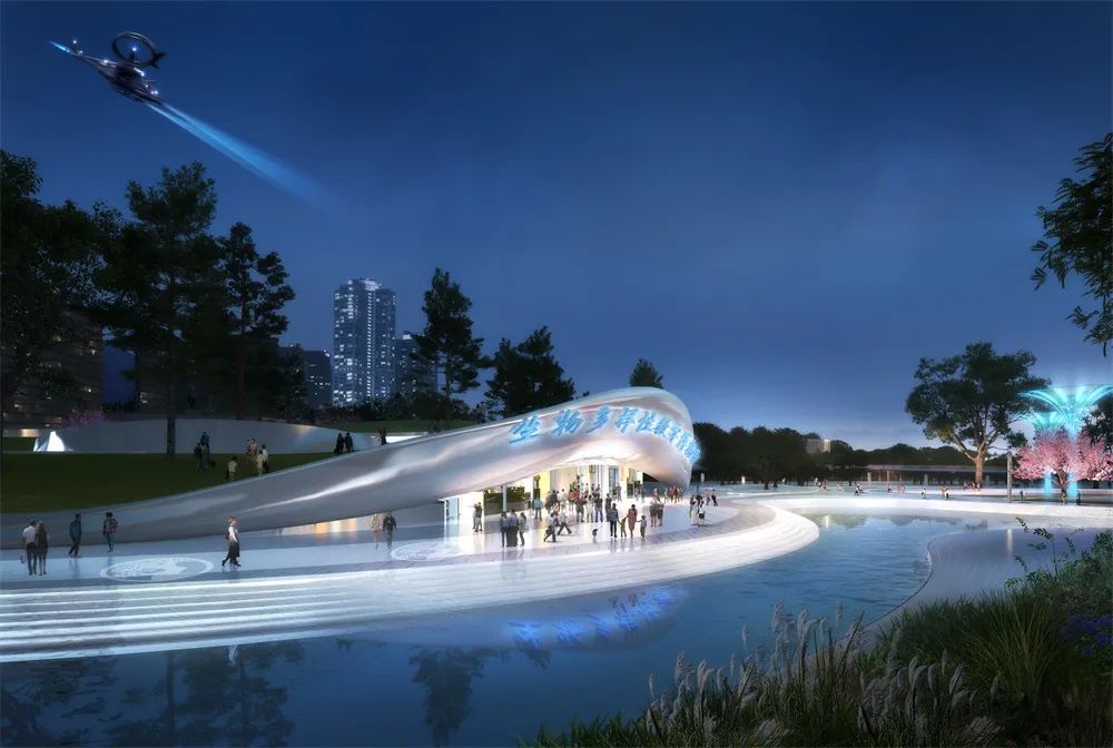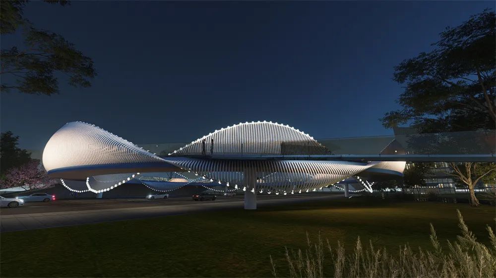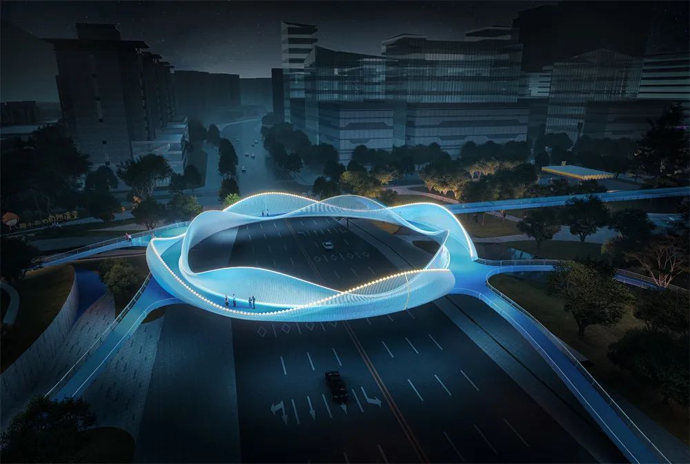 設(shè)計(jì)環(huán)形人行天橋,猶如一朵盛開(kāi)的嬌艷的花,有機(jī)聯(lián)系起項(xiàng)目的南北地塊,同時(shí)兼顧新區(qū) 大道的人行過(guò)街功能,結(jié)合燈光藝術(shù)營(yíng)造,也將成為該片區(qū)一個(gè)標(biāo)志性的打卡點(diǎn),象征著雅安因多樣而美麗,因共生而繁盛;颦h(huán)圍欄展示雅安特色物種。地面燈光按植物花色進(jìn)行分段布置,同時(shí)通過(guò)投影設(shè)備和交互式燈光等設(shè)施,增加游人體驗(yàn)感。環(huán)形橋跨越機(jī)動(dòng)車(chē)道,基因環(huán)的出現(xiàn)開(kāi)始了生物密碼的探索之旅。