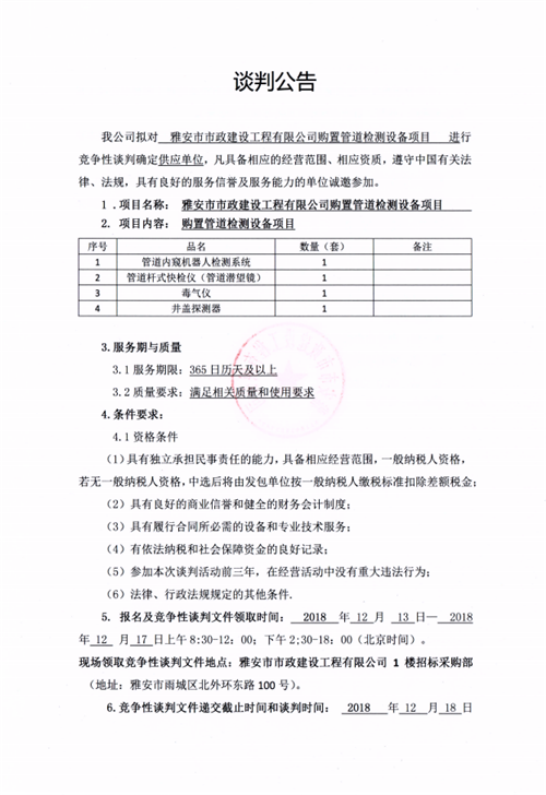 市政公司購置管道檢測設備項目的競爭性談判公告