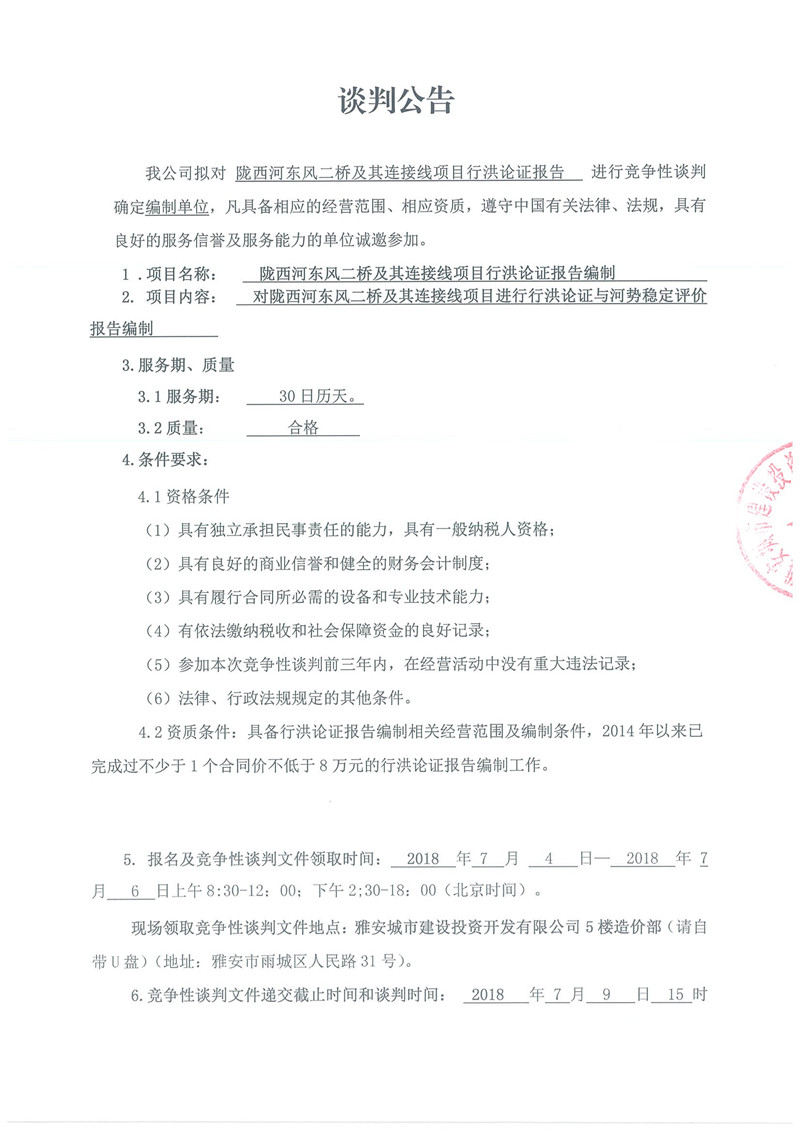 隴西河東風二橋及其連接線項目行洪論證報告編制的競爭性談判公告