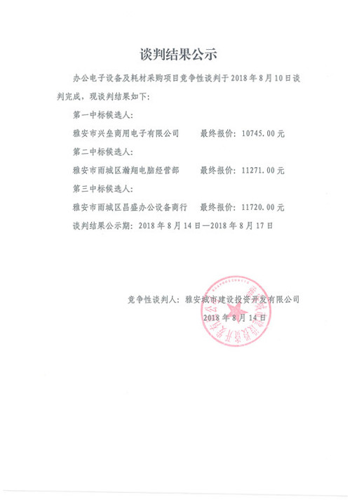 雅安城市建設(shè)投資開(kāi)發(fā)有限公司辦公電子設(shè)備及耗材采購(gòu)項(xiàng)目——競(jìng)爭(zhēng)性談判結(jié)果公示