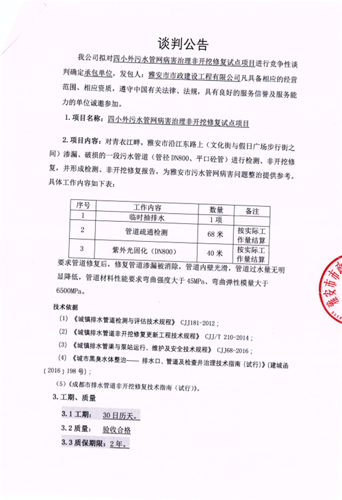 四小外污水管網(wǎng)病害治理非開挖修復(fù)試點(diǎn)項(xiàng)目競爭性談判公告(市政公司)