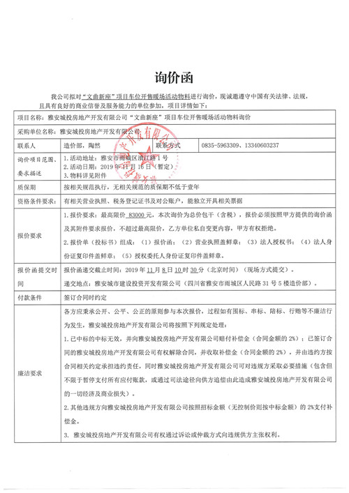 雅安城投房地產(chǎn)開發(fā)有限公司“文曲新座”項(xiàng)目車位開售暖場活動(dòng)物料詢價(jià)函(第二次)