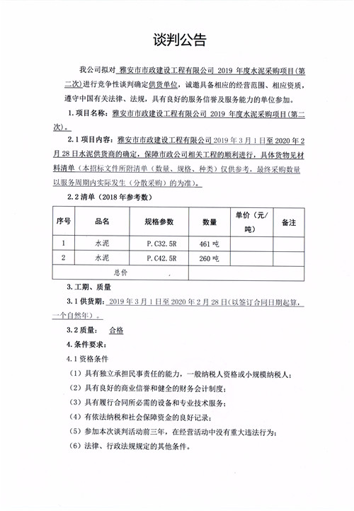 市政公司2019年度水泥采購項目(第二次)競爭性談判公告