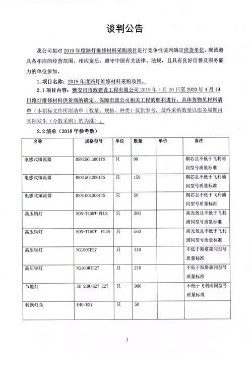 市政公司2019年度路燈維修材料采購項(xiàng)目競(jìng)爭(zhēng)性談判公告
