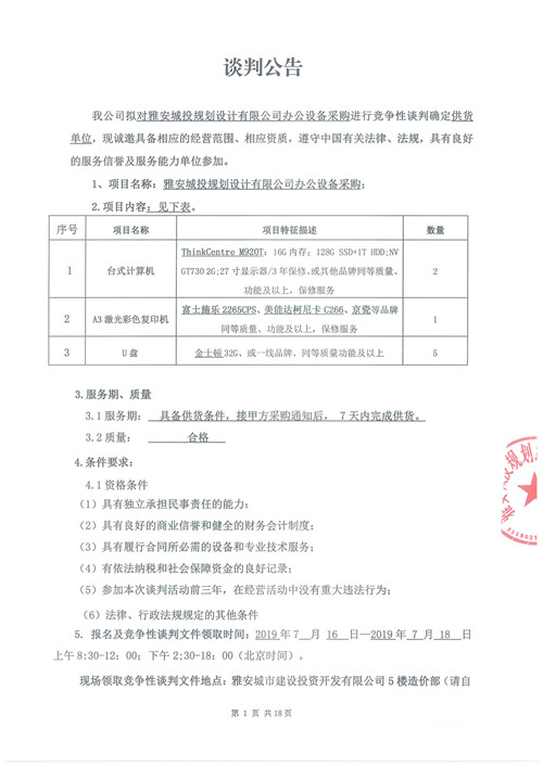 雅安城投規(guī)劃設(shè)計(jì)有限公司辦公設(shè)備采購競(jìng)爭(zhēng)性談判公告