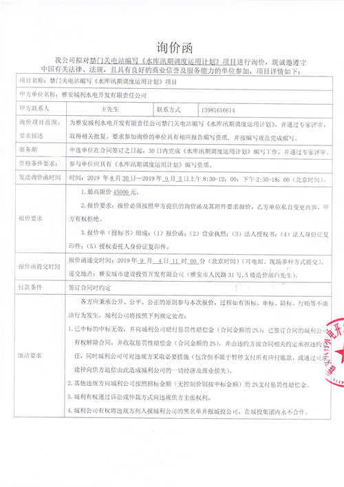 雅安城利水電開發(fā)有限責(zé)任公司禁門關(guān)電站編寫《水庫(kù)汛期調(diào)度運(yùn)用計(jì)劃》項(xiàng)目競(jìng)爭(zhēng)性談判公告