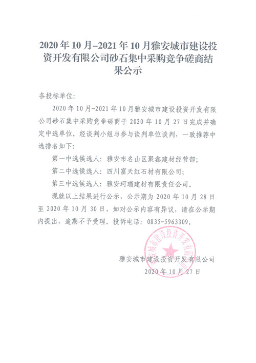 2020年10月-2021年10月雅安城市建設(shè)投資開發(fā)有限公司砂石集中采購競爭磋商結(jié)果公示
