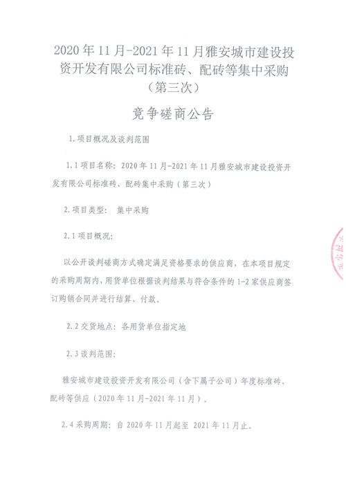2020年11月-2021年11月雅安城市建設(shè)投資開發(fā)有限公司標準磚、配磚等集中采購(第三次)競爭磋商公告