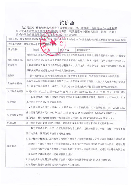 城利水電公司門坎石電站和土地溝電站《水生生物影響評(píng)價(jià)及補(bǔ)救措施專題報(bào)告》詢價(jià)函