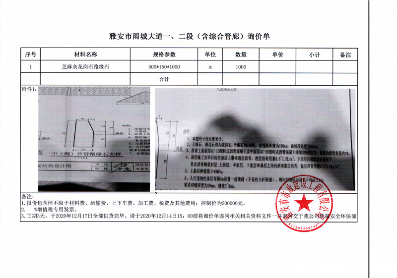 雅安市雨城大道一、二段(含綜合管廊)花崗石路緣石詢價單