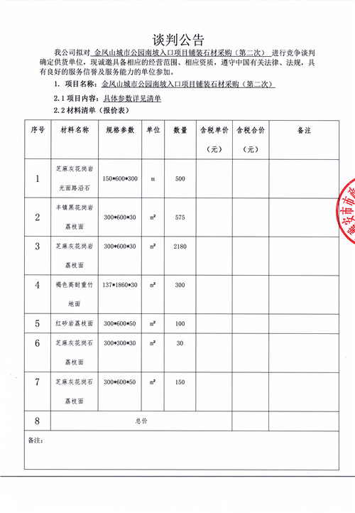 金鳳山城市公園南坡入口項(xiàng)目鋪裝石材采購(第二次)競爭性談判公告