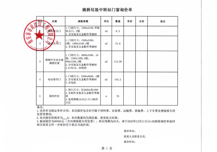 市政公司姚橋垃圾中轉(zhuǎn)站門窗詢價(jià)單