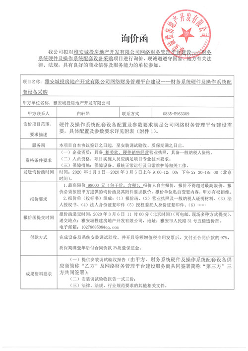 城投地產(chǎn)公司網(wǎng)絡(luò)財務(wù)管理平臺建設(shè)——財務(wù)系統(tǒng)硬件及操作系統(tǒng)配套設(shè)備采購項目詢價函