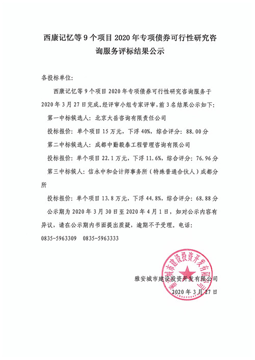 西康記憶等9個項目2020年專項債券可行性研究咨詢服務(wù)評標(biāo)結(jié)果公示