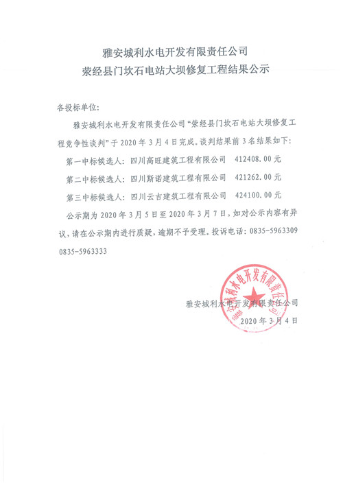 滎經(jīng)縣門坎石電站大壩修復工程結果公示