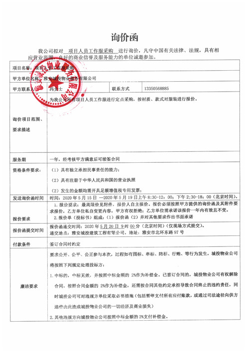 城投物業(yè)公司項(xiàng)目人員工作服采購(gòu)詢(xún)價(jià)函