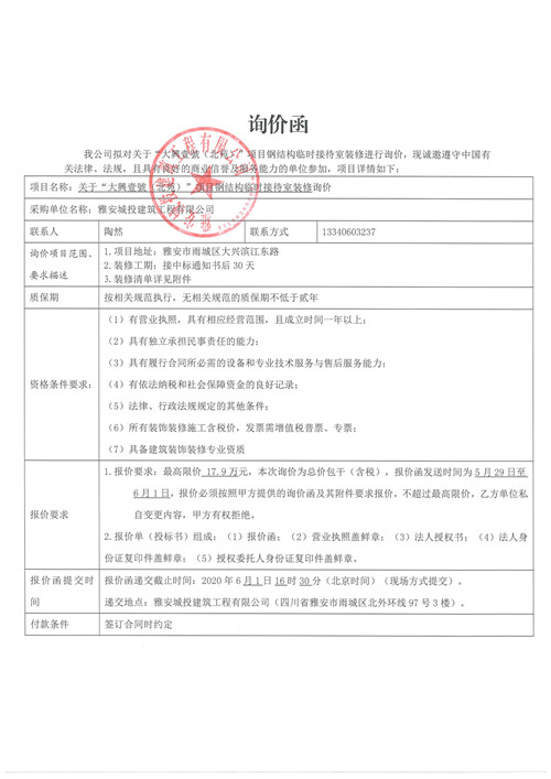 城投建工公司“大興壹號(北苑)”項目鋼結構 臨時接待室裝修的詢價函