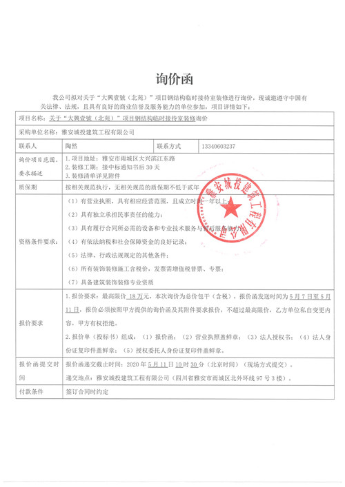 城投建工公司大興壹號(hào)(北苑)項(xiàng)目鋼結(jié)構(gòu)臨時(shí)接待室裝修詢(xún)價(jià)函