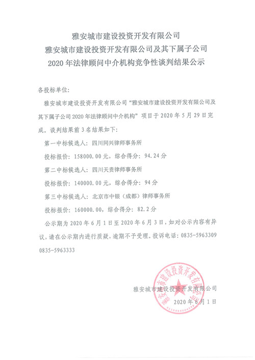 雅安城市建設(shè)投資開發(fā)有限公司及其下屬子公司2020年法律顧問中介機構(gòu)競爭性談判結(jié)果公示