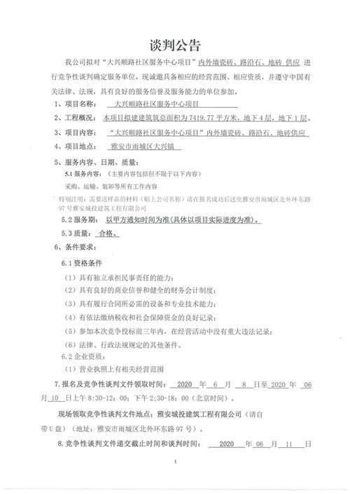 城投建工公司“大興順路社區(qū)服務(wù)中心項(xiàng)目”內(nèi)外墻瓷磚、路沿石、地磚供應(yīng)競(jìng)爭(zhēng)性談判公告(第二次)