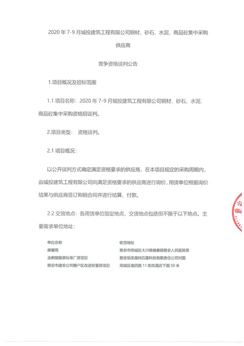 2020年7月-9月城投建筑工程有限公司鋼材、砂石、水泥、商品砼集中采購(gòu)供應(yīng)商競(jìng)爭(zhēng)性資格談判公告