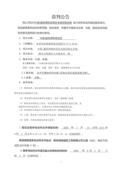 城投建工公司中國·藏茶博物館項(xiàng)目電梯采購安裝競爭性談判公告