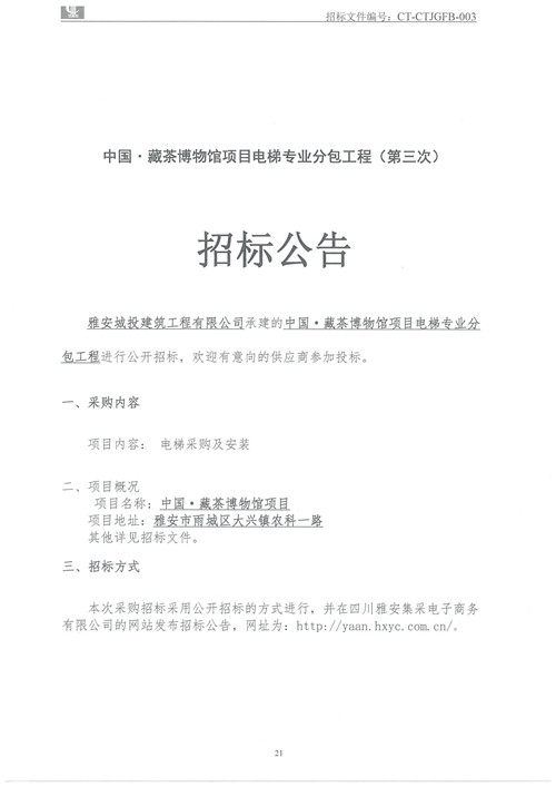 城投建工公司中國·藏茶博物館項(xiàng)目電梯專業(yè)分包工程招標(biāo)公告(第三次)