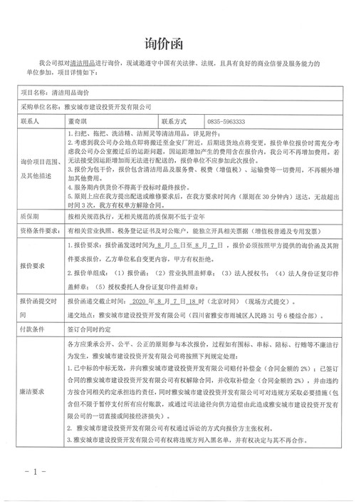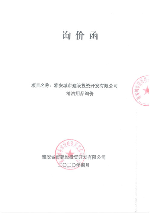 雅安城市建設(shè)投資開(kāi)發(fā)有限公司清潔用品詢(xún)價(jià)函