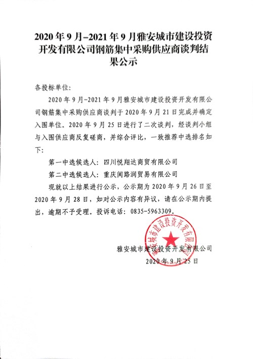 2020年9月—2021年9月雅安城市建設投資開發(fā)有限公司鋼筋集中采購供應商談判結果公示