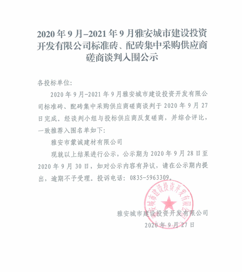 2020年9月-2021年9月雅安城市建設(shè)投資開發(fā)有限公司標(biāo)準(zhǔn)磚、配磚集中采購供應(yīng)商磋商談判入圍公示