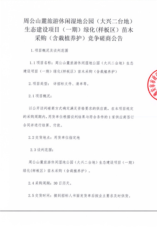 周公山麓旅游休閑濕地公園(大興二臺(tái)地)生態(tài)建設(shè)項(xiàng)目(一期)綠化(樣板區(qū))苗木采購(含栽植養(yǎng)護(hù))競(jìng)爭(zhēng)磋商公告