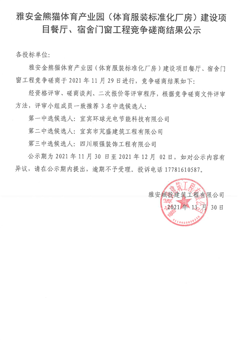 雅安金熊貓?bào)w育產(chǎn)業(yè)園(體育服裝標(biāo)準(zhǔn)化廠房)建設(shè)項(xiàng)目餐廳、宿舍門(mén)窗工程競(jìng)爭(zhēng)磋商結(jié)果公示