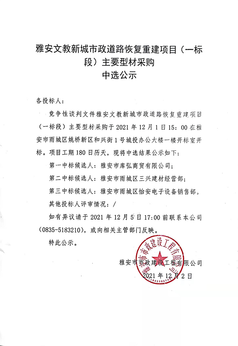雅安文教新城市政道路恢復(fù)重建項(xiàng)目(一標(biāo)段)主要型材采購(gòu)中選公示