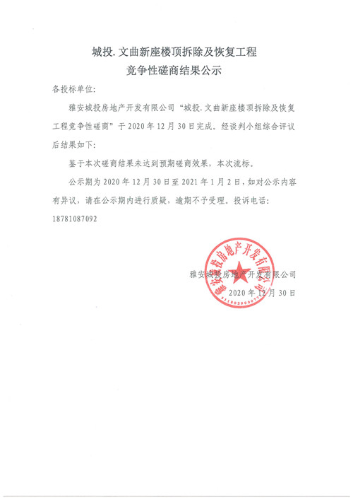 城投·文曲新座樓頂拆除及恢復(fù)工程競(jìng)爭(zhēng)性磋商結(jié)果公示