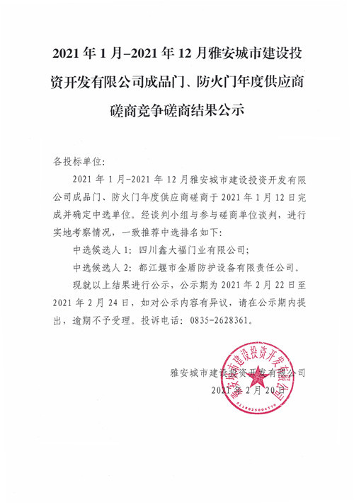 2021年1月-2021年12月雅安城市建設(shè)投資開發(fā)有限公司成品門、防火門年度供應(yīng)商磋商競(jìng)爭(zhēng)磋商結(jié)果公示