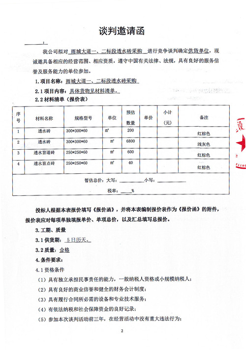市政公司雨城大道一、二標(biāo)段透水磚采購競爭性談判公告