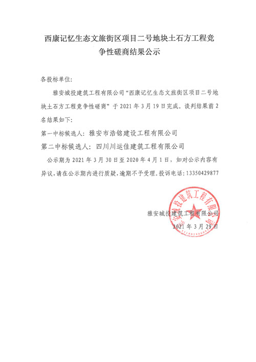 城投建工公司雅安市西康記憶生態(tài)文旅街區(qū)項(xiàng)目二號(hào)地塊土石方工程競爭性磋商結(jié)果公示