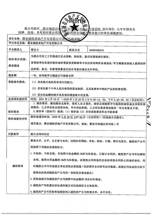 城投地產(chǎn)公司工作服采購(gòu)詢價(jià)函