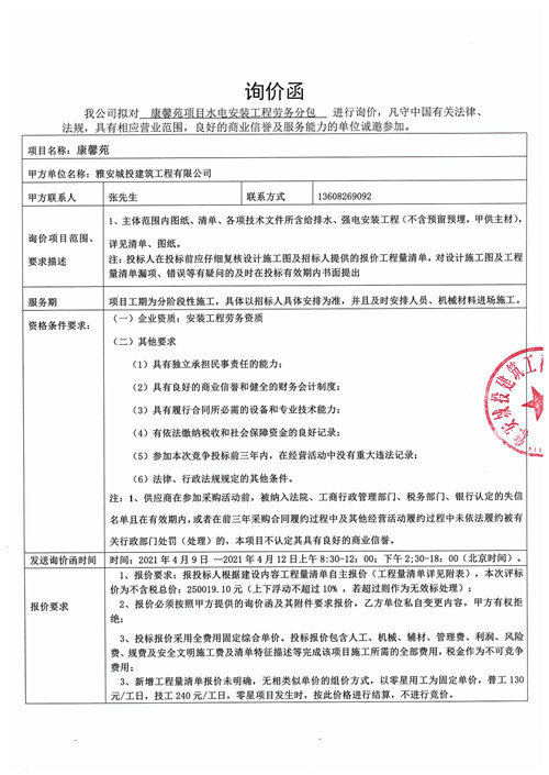 城投建工公司項(xiàng)目水電安裝工程勞務(wù)分包詢(xún)價(jià)函