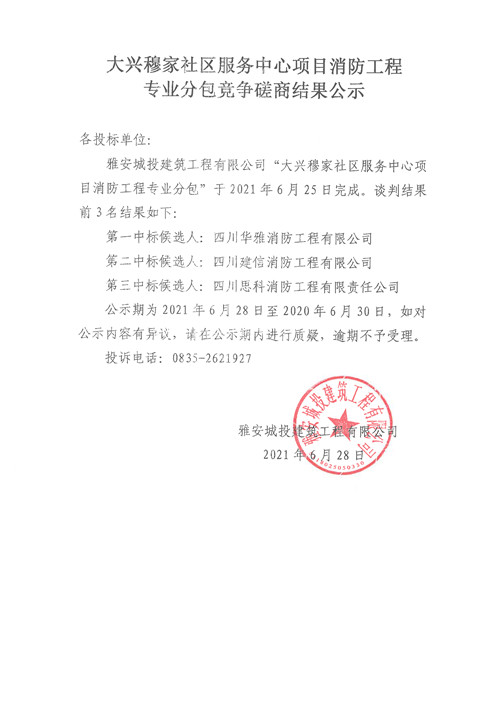 城投建工公司大興穆家社區(qū)服務(wù)中心項目消防工程專業(yè)分包競爭性磋商結(jié)果公示