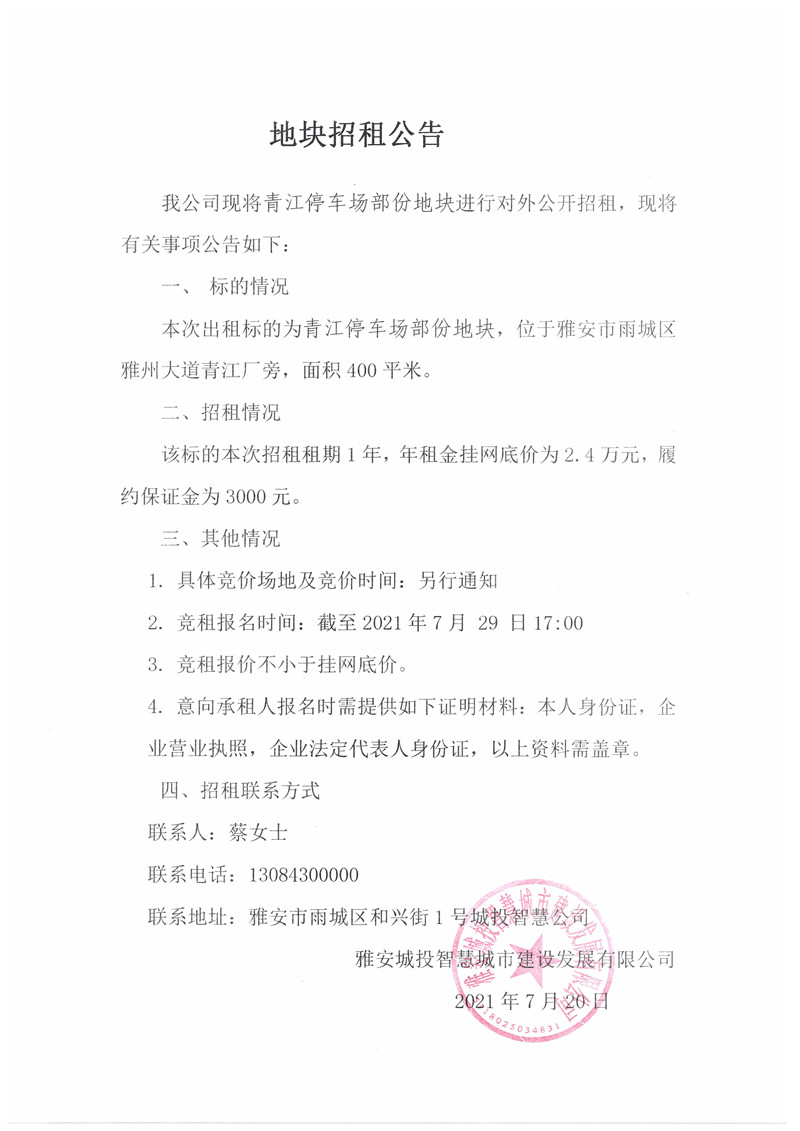 城投智慧公司青江停車場部分地塊招租公告(400㎡)