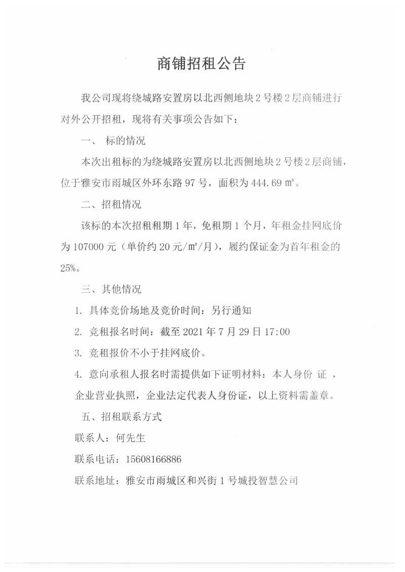 城投智慧公司繞城路安置房以北地塊2號(hào)樓2層商鋪招租公告