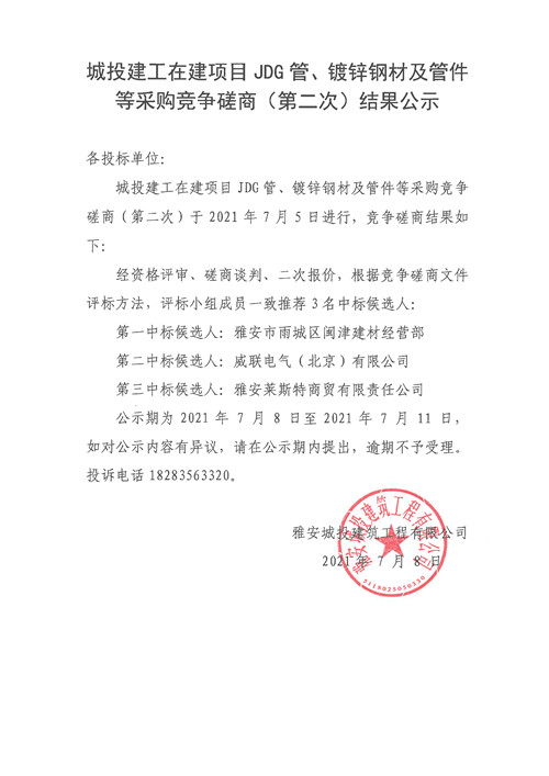 城投建工公司在建項目JDG管、鍍鋅鋼材及管件等采購競爭性磋商(第二次)結(jié)果公示