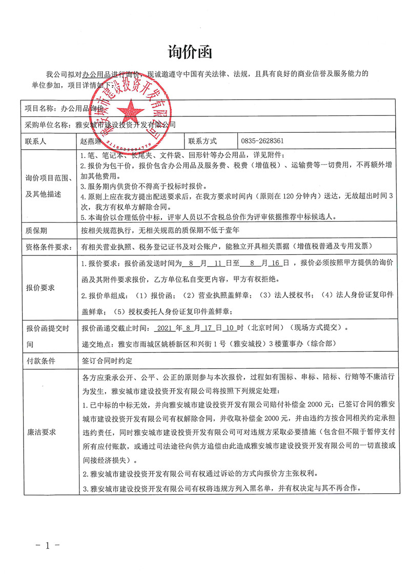 城投公司辦公用品詢價函