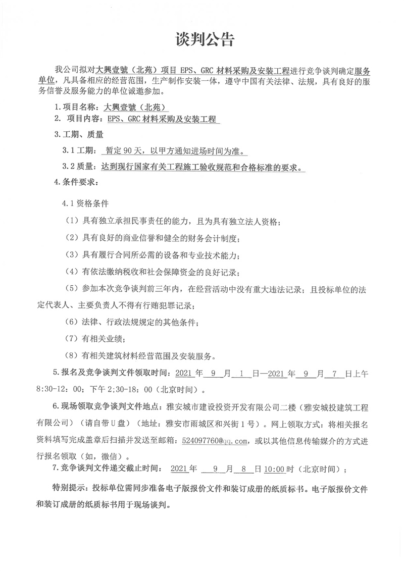 大興壹號(hào)(北苑)項(xiàng)目EPS、GRC材料采購及安裝工程競爭談判公告