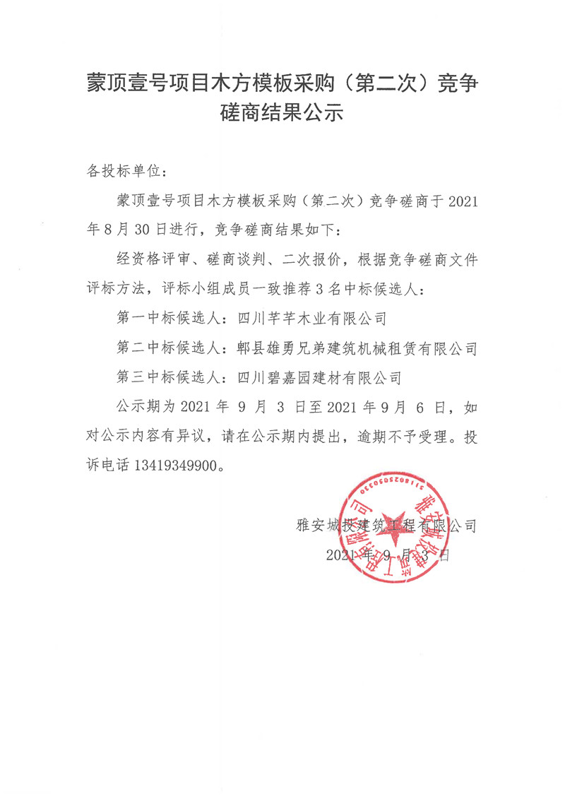 城投建工公司蒙頂壹號(hào)項(xiàng)目木方模板采購(gòu)(第二次)競(jìng)爭(zhēng)磋商結(jié)果公示