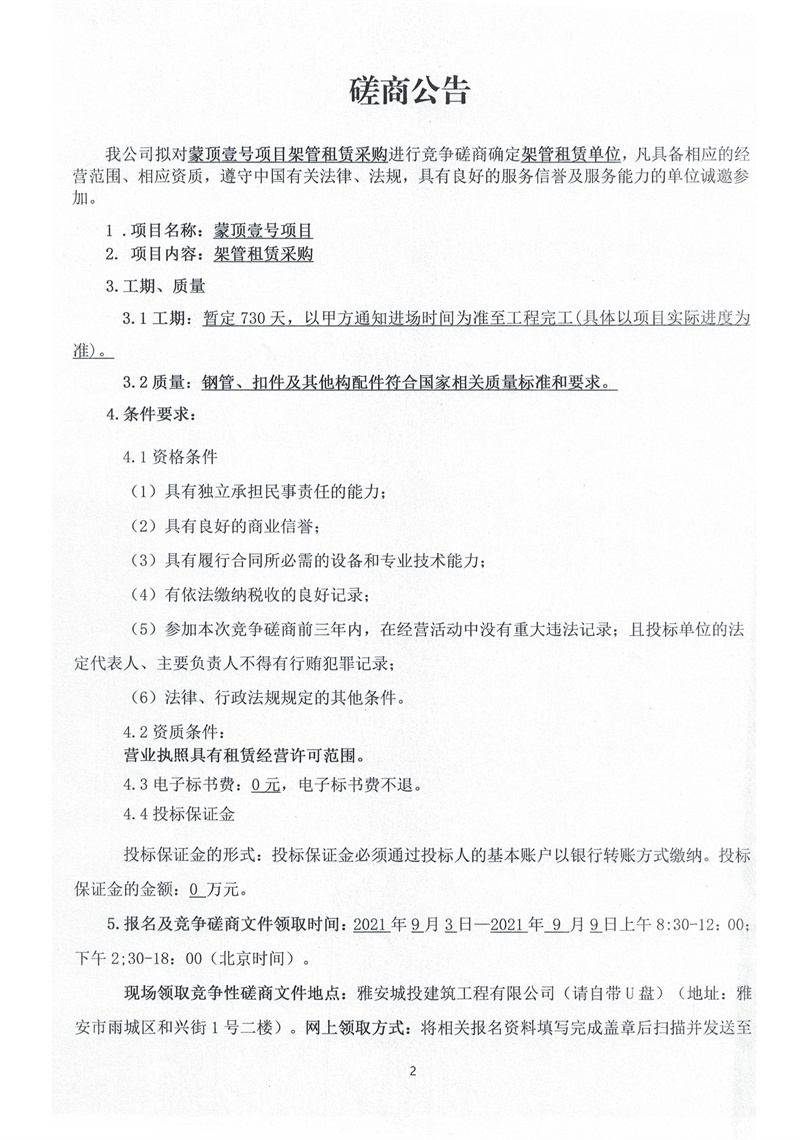 蒙頂壹號項目架管租賃采購競爭磋商公告